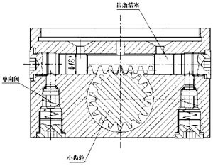 其工作原理是:板动手柄,通过齿轮轴上的小齿轮(如图2)带动齿条活塞作往返复运动。当活塞处于右端极限位置左行量,润滑脂通过单向阀经过换向阀被压入主油管,当滑动活塞行程终了,到达左端极度限位置时,滑动活塞右端的腔室又被贮油器中有润滑脂所充满。当滑动活塞再向右移动时 ,滑动活塞右端的单向阀,经换向阀而被压入主油管,这样继续扳动手柄,油泵将不断地往复运动,把润滑脂不断地压向各组给油器。