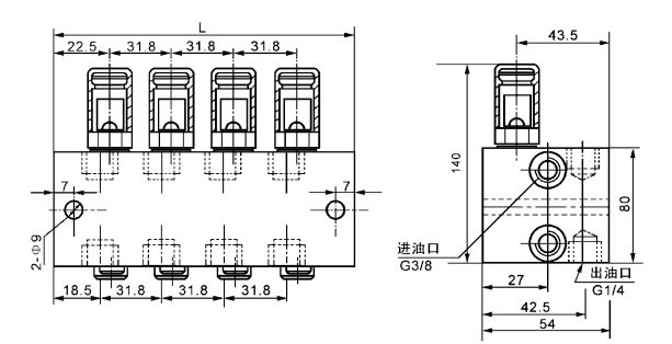 若需相应上下出口合并时,只需将上出油孔内的压紧螺塞用6mm内六角扳手拧出,取出分油套通孔向下装入,再拧紧压紧螺塞,此时上出口用G1/4螺塞封堵以防灰尘侵入。