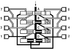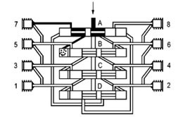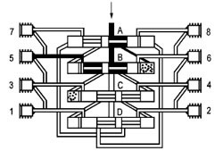 这时活塞B至D从左侧向右侧运动,按以上相反方向顺序动作完成一个周期循环并可重新开始一个新的循环。