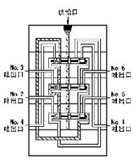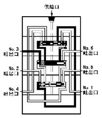 5、流入的润滑剂推动活塞C向右移动、右腔的润滑剂压向NO.4吐出口经外部配管送向润滑点。当活塞C运动至右极限时活塞B左腔开始进入润滑剂。