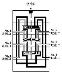 4、流入的润滑剂推动活塞A向左移动、左腔的润滑剂压向NO.3吐出口经外部配管送向润滑点。当活塞A运动至左极限时活塞C右腔开始进入润滑剂。