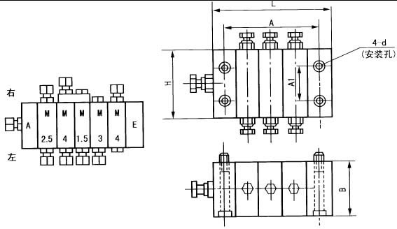 | 说明:递进分配器的组合按进油口元件首块A、工作块M和尾块E、从左到右排列,在队列下方出口称为左,在队列上方出口称为右。如图 |