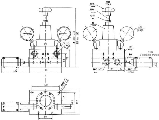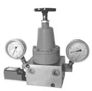 本阀为二位四通自动液压换向阀,上平面设有两块压力表和调压手轮。换向压力由手轮调节,顺时针压力升高,反之压力降低。本阀门进油口P与泵出油口连接,回油口R接贮油桶,供油口Ⅰ、Ⅱ分别与两条供油管路连接。工作时当Ⅰ路油压达设定压力,换向阀自动切换到Ⅱ路,这样润滑泵就能循环往复地向两条管路供送润滑脂。