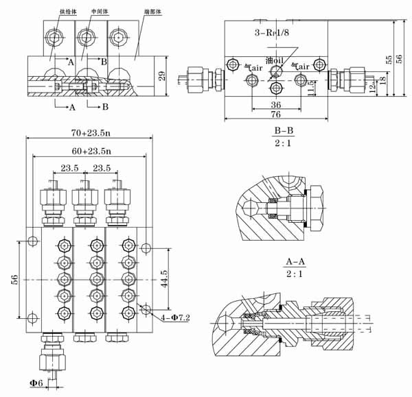 | SMX*-YQ型油-气分配混合器,是由模块式的单线递进分配器和混合器组合叠加而成。设有一个进油口,二个进气口,3~16个油气出口。适用于单线二分式油气润滑系统和双线-递进式油气润滑系统中。 |